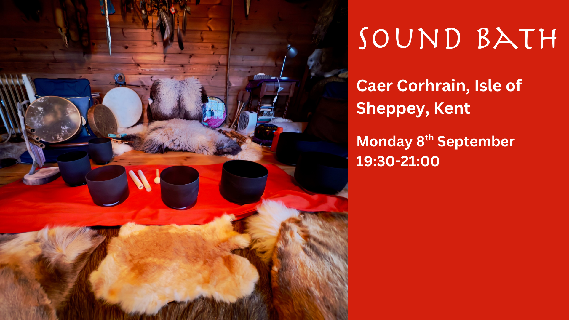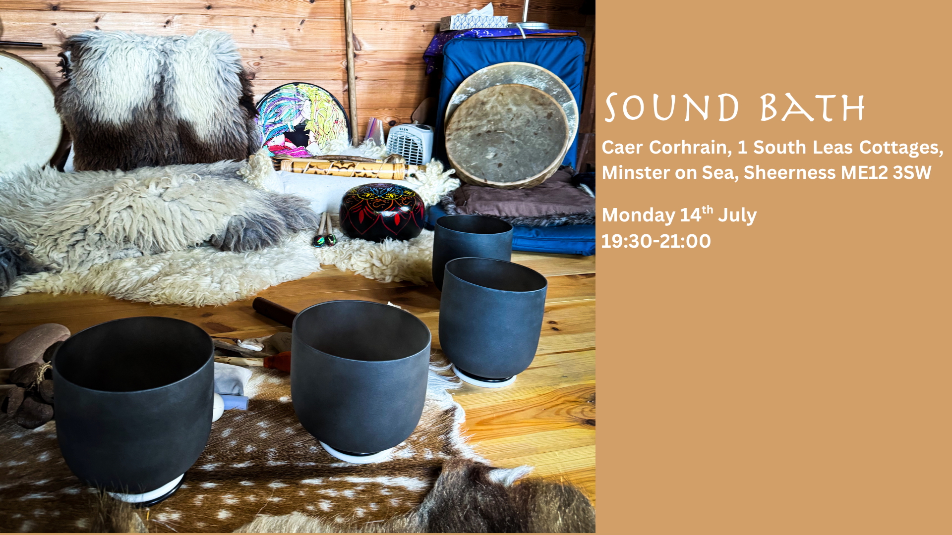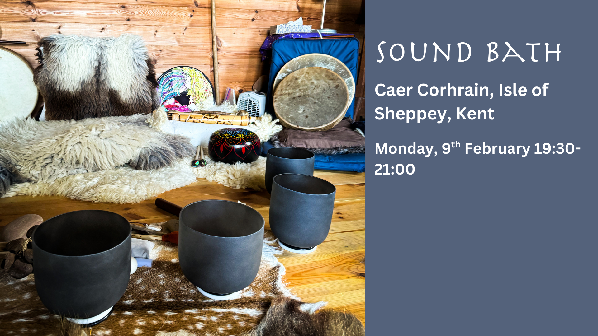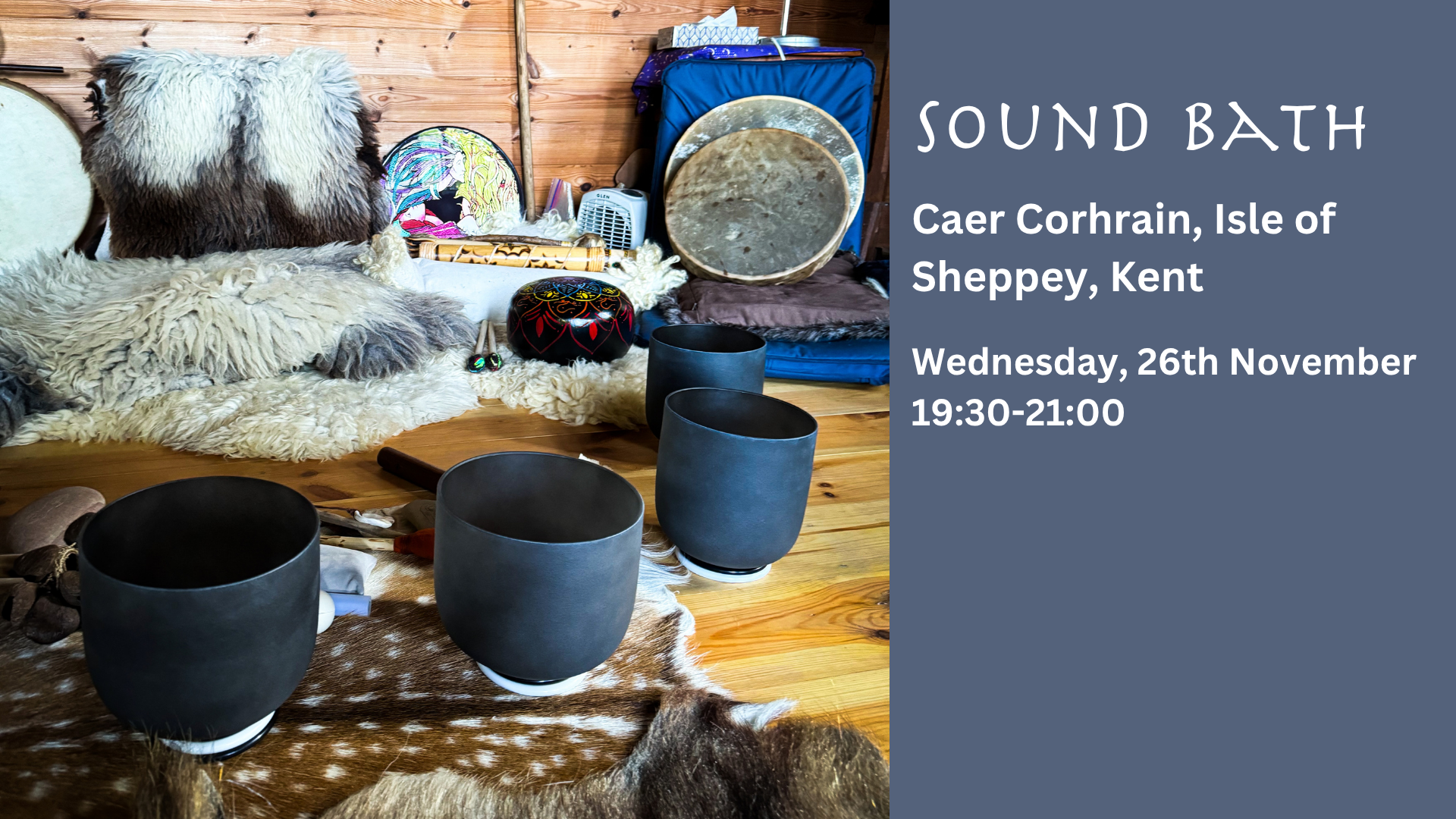 Come join me in the wonderfully warm & cosy sacred space of Herons house. Snuggle down into the soft beautiful furs and let the healing sounds from crystal bowls, tongue drums, tubular bells and chimes flow and lead you into peace, calm and contentment for overall well-being. Limited spaces to make your experience unique and personal.